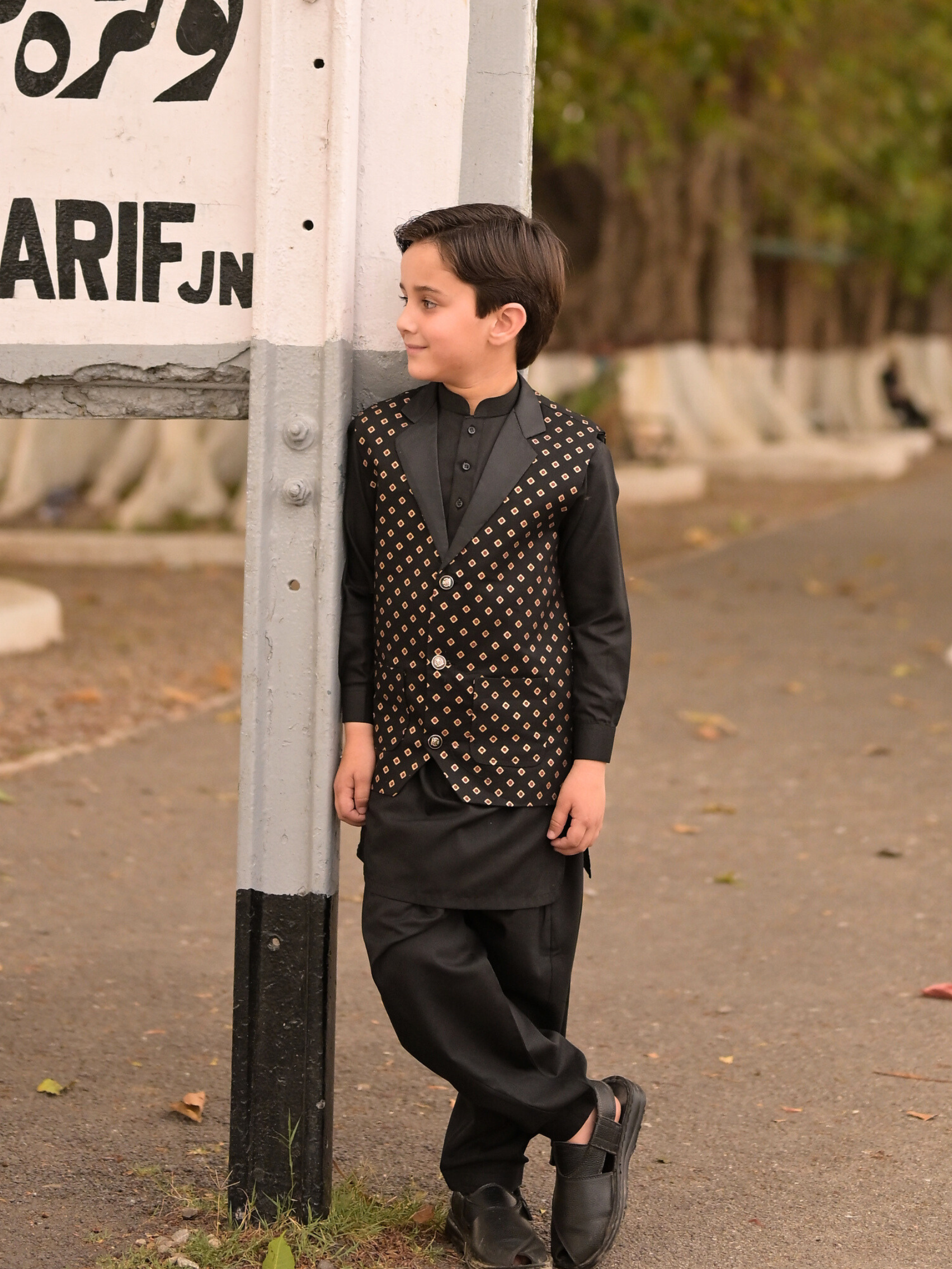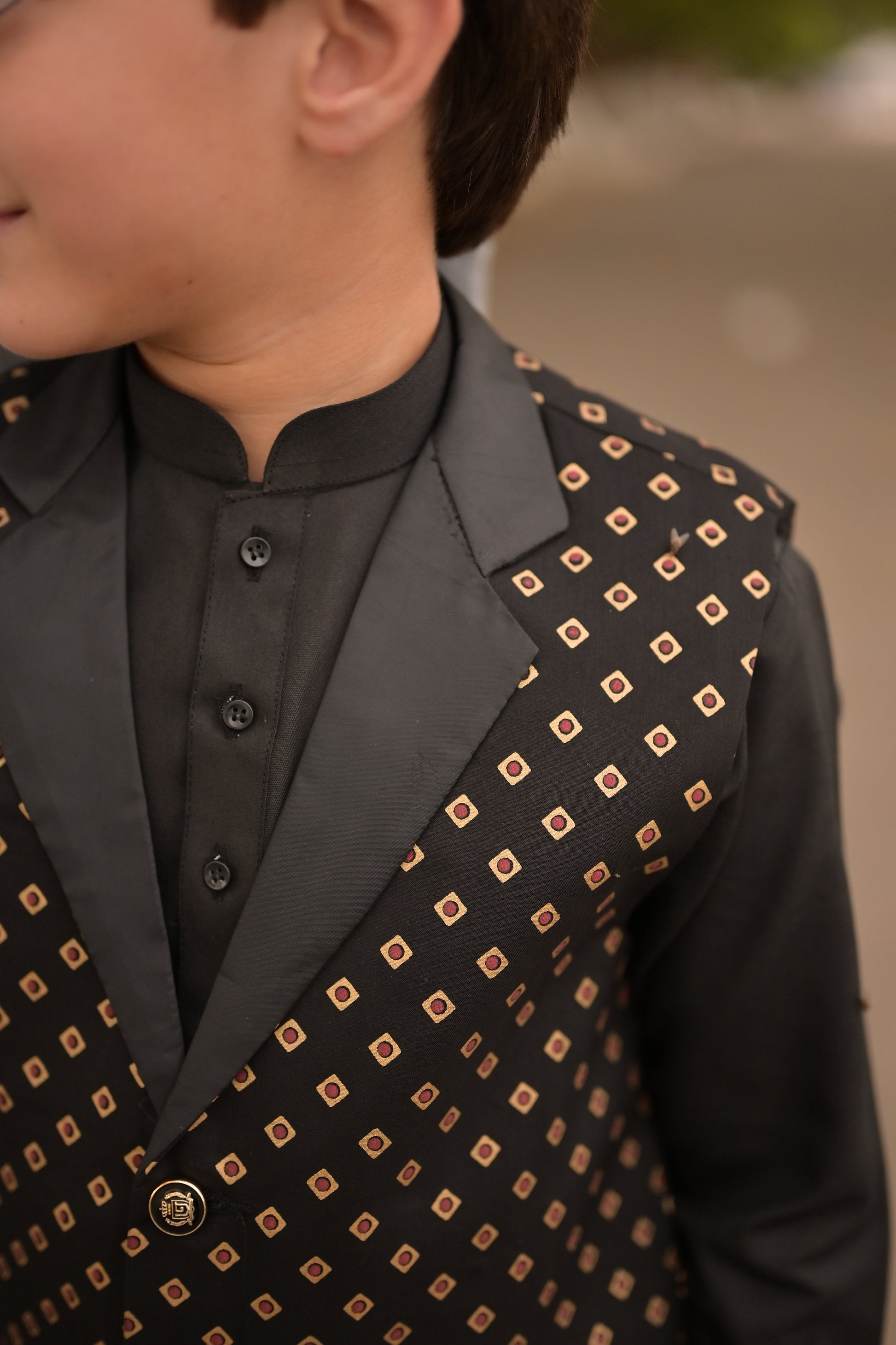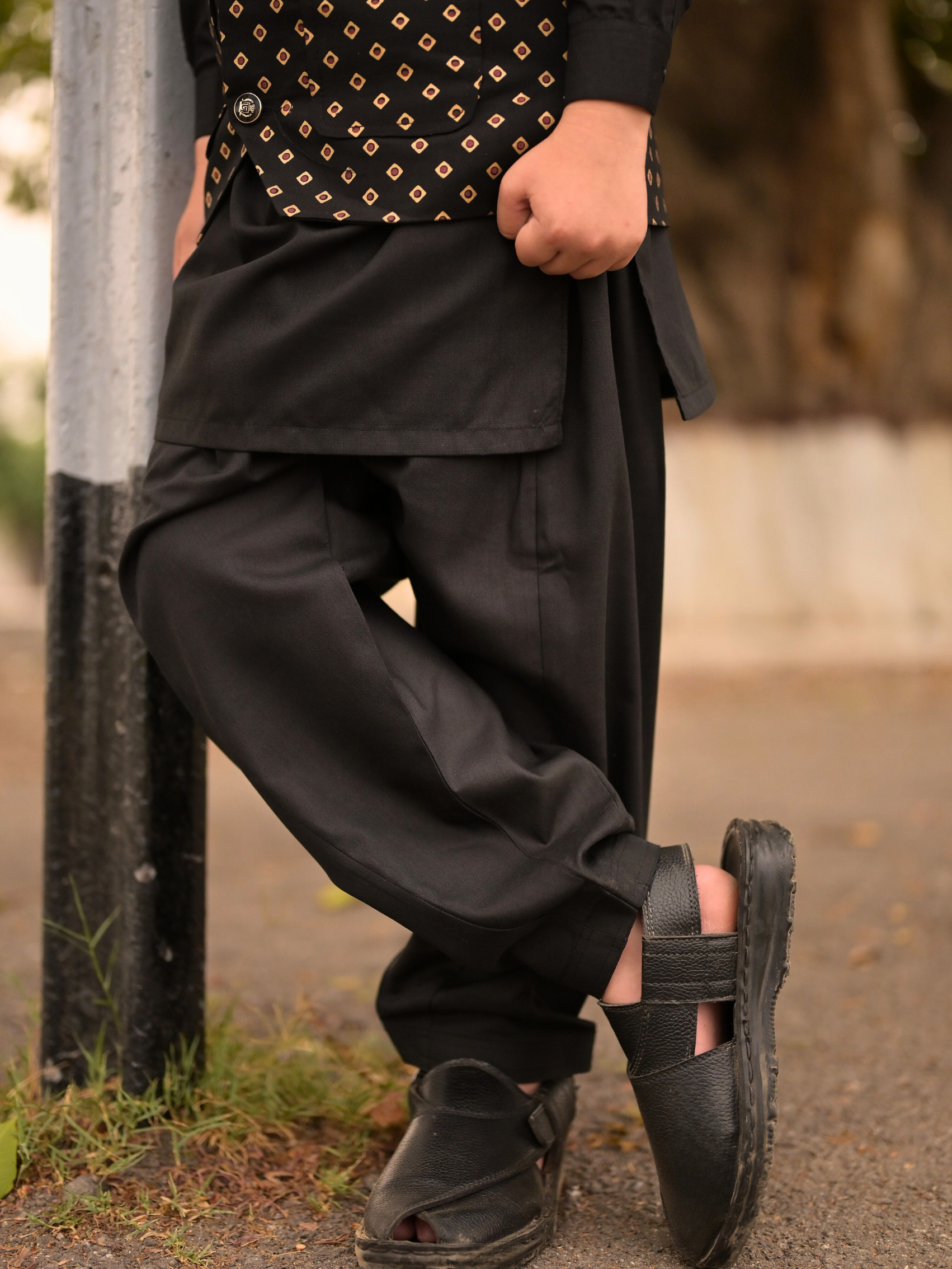 This stylish Black Chunri set for boys features a cotton block printed waistcoat and matching black shalwar kameez. The cuffed sleeves and ban collar add a touch of sophistication to this traditional outfit.