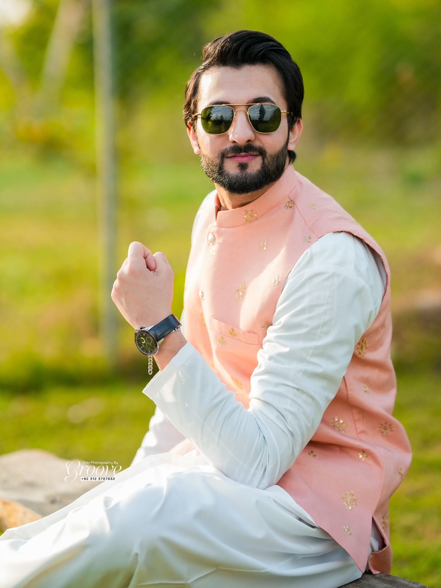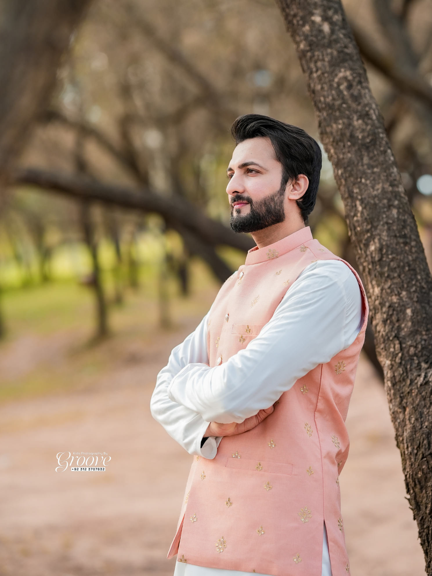- Off-white shirt paired with pants, featuring a ban collar and cuff sleeves for timeless sophistication.
