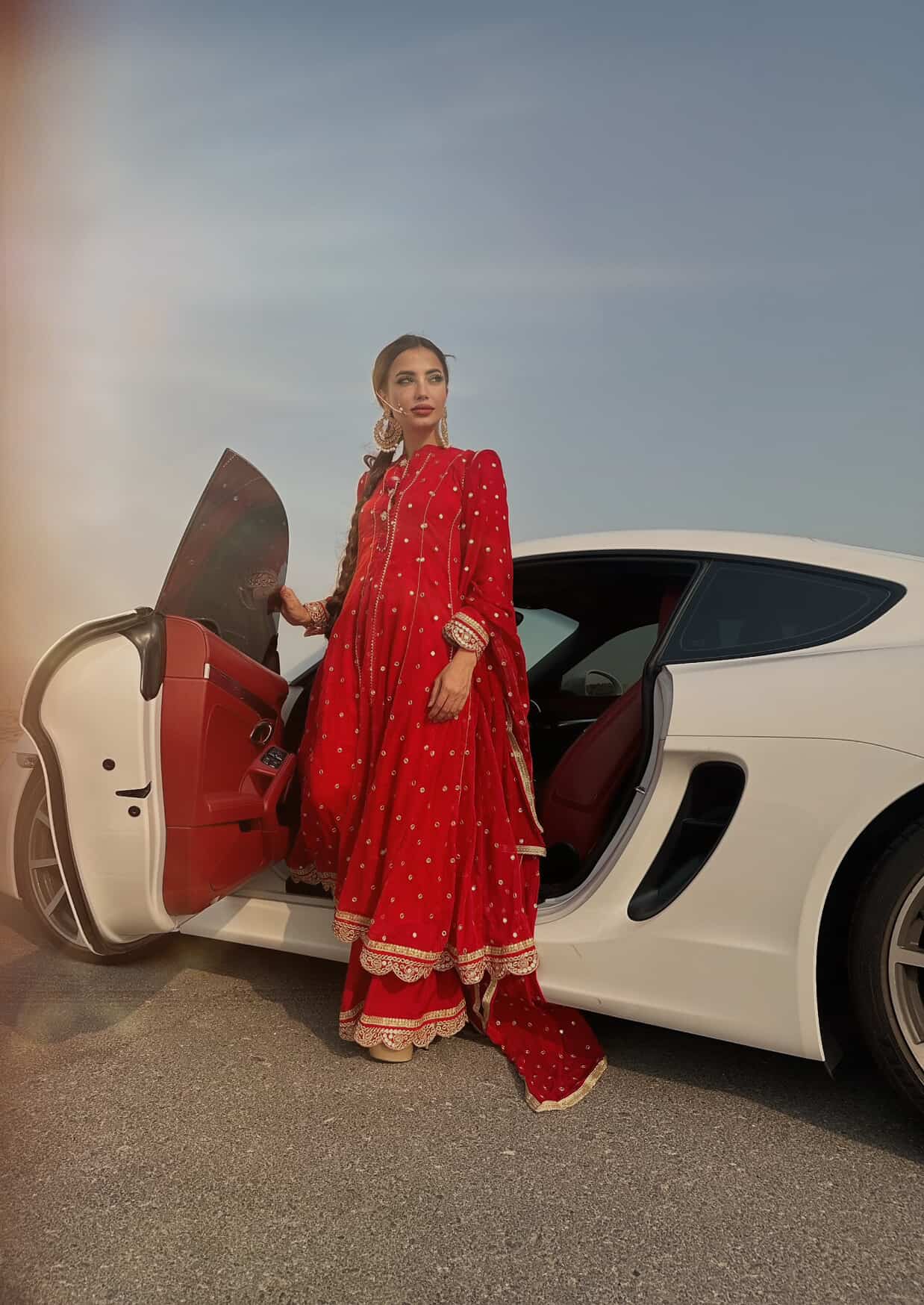 This stunning Rang-e-Haya frock features a classic red chiffon kalidaar design, adorned with intricate gold work and laces . Its soft cotton lining ensures comfort and ban collar with button pati adds a unique element. Complete the look with the included viscose plazo pants.
